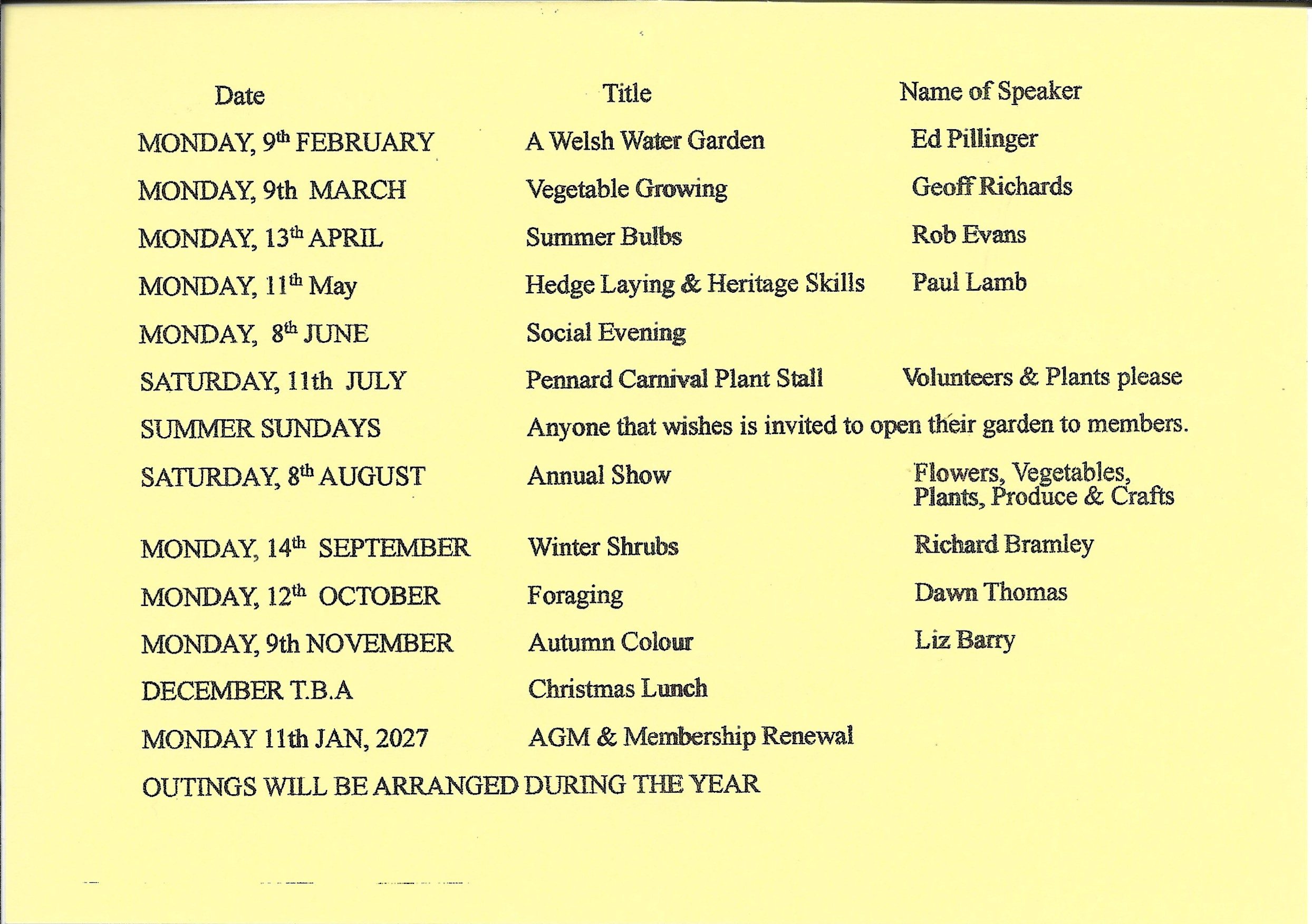 Meetings will be held on the second Monday of the month at 7:15pm at the Community Hall. Our schedule of speakers/events are can be found by clicking here. Be aware that this is a tentative program, and may be subject to change.